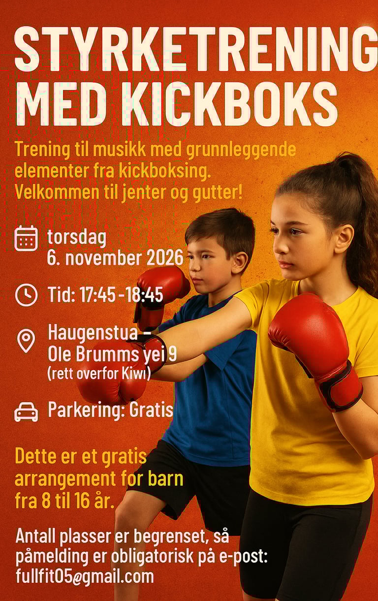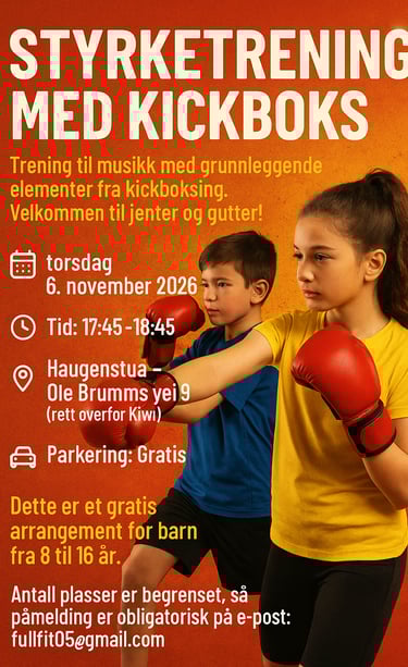 Dette blir en time med musikk, bevegelse og trening der barna får bruke energi, bygge styrke og lære noen grunnleggende elementer fra kickboksing – på en trygg og gøyal måte.